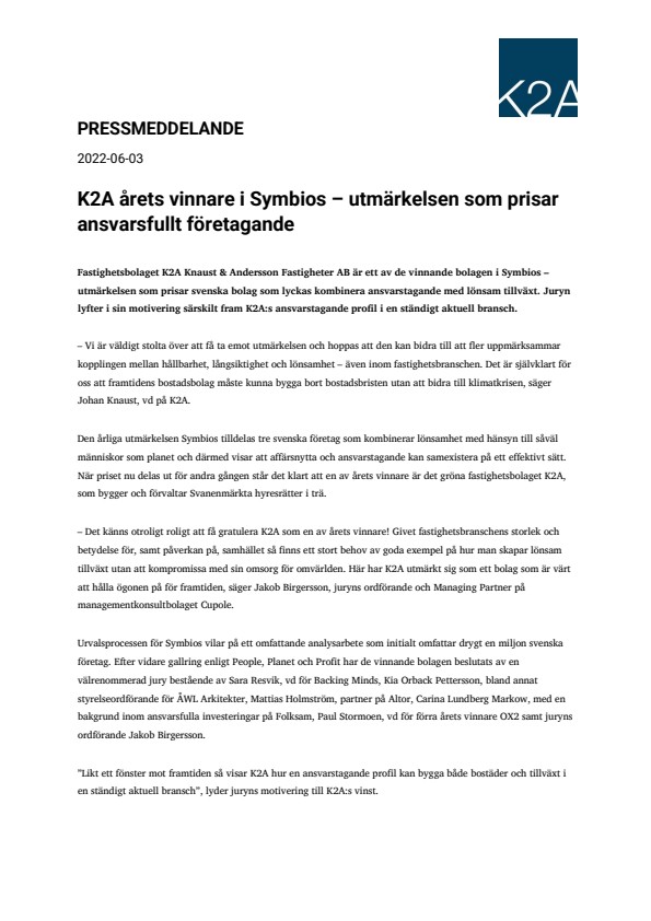 Den årliga utmärkelsen Symbios tilldelas tre svenska företag som kombinerar lönsamhet med hänsyn till såväl människor som planet och därmed visar att affärsnytta och ansvarstagande kan samexistera på ett effektivt sätt. När priset nu delas ut för andra gången står det klart att en av årets vinnare är det gröna fastighetsbolaget K2A, som bygger och förvaltar Svanenmärkta hyresrätter i trä.