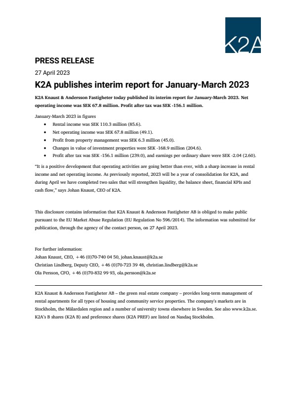 “It is a positive development that operating activities are going better than ever, with a sharp increase in rental income and net operating income. As previously reported, 2023 will be a year of consolidation for K2A, and during April we have completed two sales that will strengthen liquidity, the balance sheet, financial KPIs and cash flow,” says Johan Knaust, CEO of K2A.