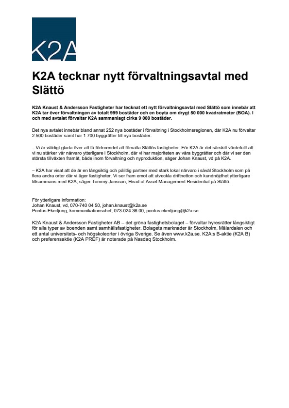 – K2A har visat att de är en långsiktig och pålitlig partner med stark lokal närvaro i såväl Stockholm som på flera andra orter där vi äger fastigheter. Vi ser fram emot att utveckla driftnetton och kundnöjdhet ytterligare tillsammans med K2A, säger Tommy Jansson, Head of Asset Management Residential på Slättö.