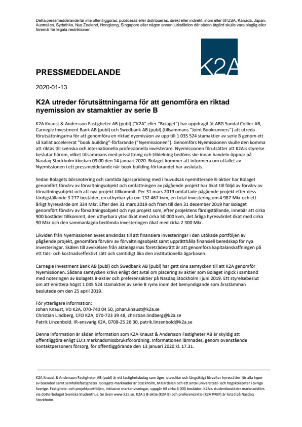 K2A Knaust & Andersson Fastigheter AB (publ) (”K2A” eller ”Bolaget”) har uppdragit åt ABG Sundal Collier AB, Carnegie Investment Bank AB (publ) och Swedbank AB (publ) (tillsammans ”Joint Bookrunners”) att utreda förutsättningarna för att genomföra en riktad nyemission av upp till 1 035 524 stamaktier av serie B genom ett så kallat accelererat ”book building”-förfarande (”Nyemissionen”). Genomförs Nyemissionen skulle den komma att riktas till svenska och internationella professionella investerare. Nyemissionen förutsätter att K2A:s styrelse beslutar härom, vilket tillsammans med prissättning och tilldelning bedöms ske innan handeln öppnar på Nasdaq Stockholm klockan 09.00 den 14 januari 2020. Bolaget kommer att informera om utfallet av Nyemissionen i ett pressmeddelande när book building-förfarandet har avslutats.