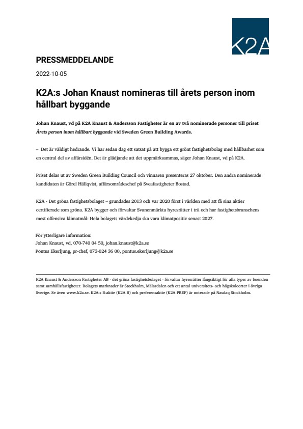 K2A – Det gröna fastighetsbolaget – grundades 2013 och var 2020 först i världen med att få sina aktier certifierade som gröna. K2A bygger och förvaltar Svanenmärkta hyresrätter i trä och har fastighetsbranschens mest offensiva klimatmål: Hela bolagets värdekedja ska vara klimatpositiv senast 2027.